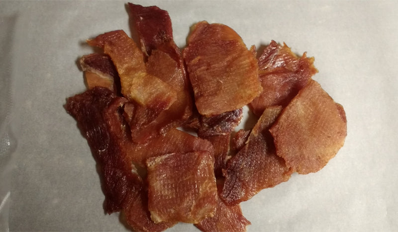 How It’s Made: Sliced thin. Fat completely removed. Placed in dehydrator for between 6 and 7 hours; depending on batch size. Removed From dehydrator and allowed to cool. Tested for quality by our adorable treat testers. Vacuum sealed with an oxygen absorber and then shipped to your door!